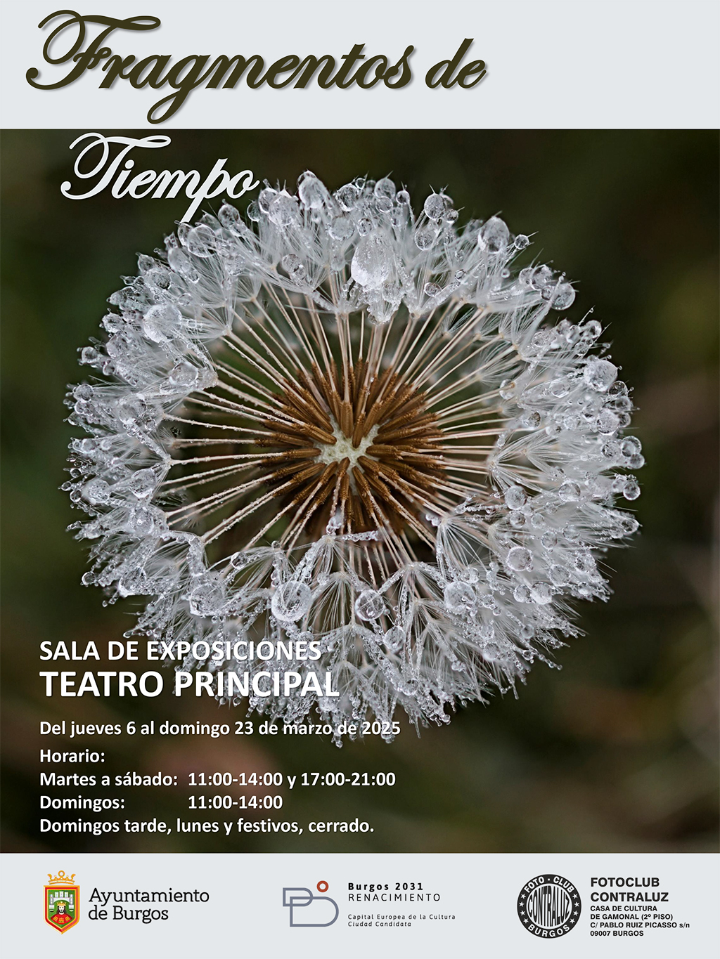 En esta nueva exhibición “Fragmentos de tiempo” Fotoclub Contraluz Burgos les invita a un recorrido visual en el que las fotógrafas y fotógrafos expresan, de manera particular y colectiva, sus miradas detenidas en instantes precisos y preciosos, a través de sus capturas.